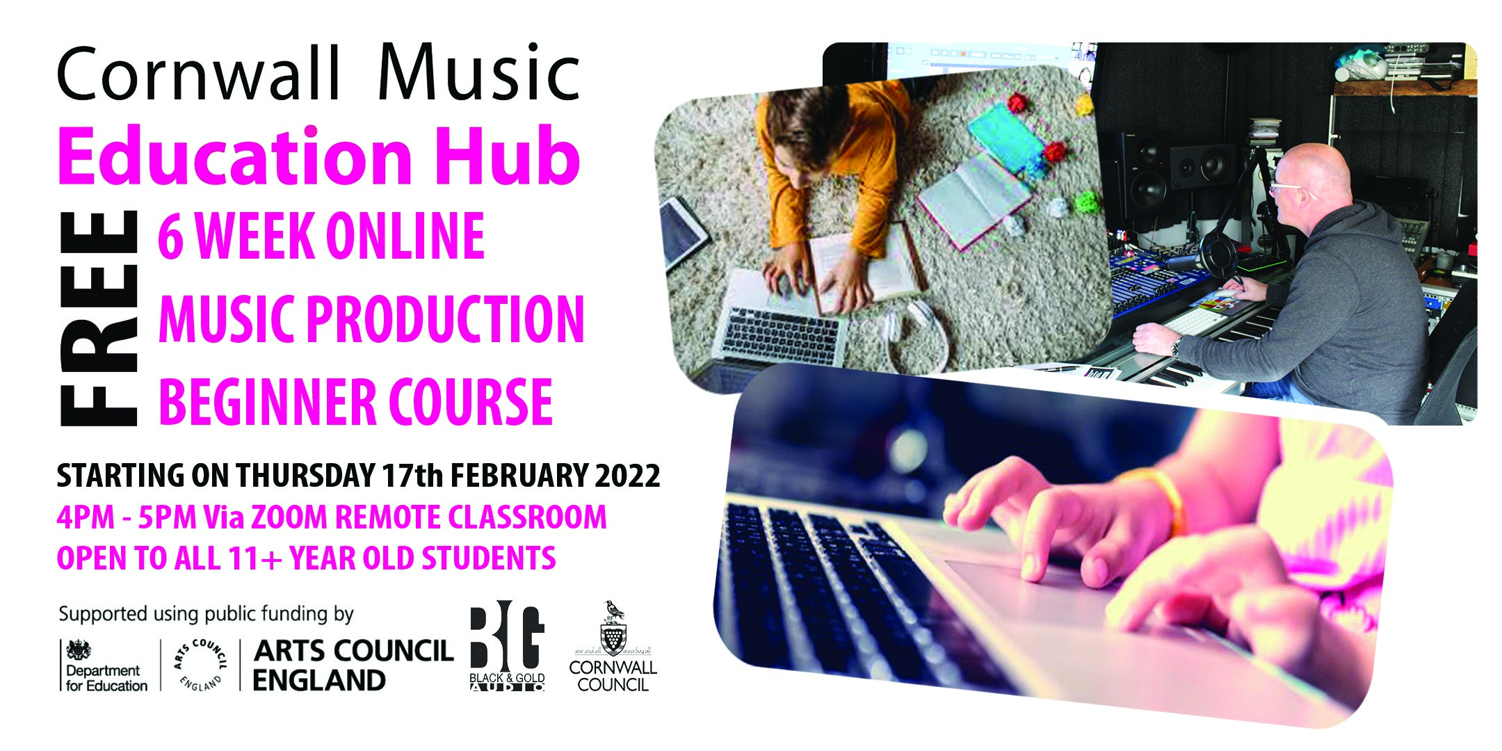 Learn how to make your own music using specialist software. These 6 week online courses are fully funded by the Cornwall Music Education Hub and are completely free to young people in Cornwall and the Isles of Scilly.
